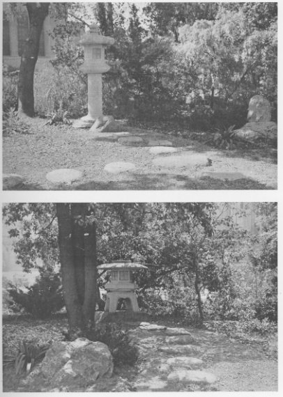 Plate 2. Japanese stone lanterns on the University of California campus. Sent from Japan by the Nippon Alumini Association of the University of California. Upper: Sangatsudo gata, a faithful reproduction specially made of the famous thirteenth century lantern standing in front of the Sangatsudo, Todaiji monastery, Nara. Lower: Yukimi-gata (snow-viewing) type of lantern.