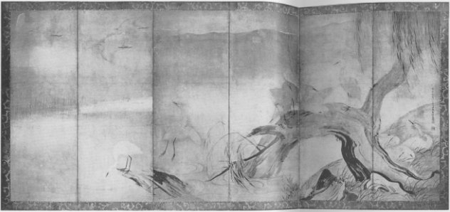 A noted Zen priest once pointed to the whiteness of the heron and the blackness of the crow as an example of those who remain natural, unaffected by the teachings of Buddha. He observed that the heron is white, though it bleaches not; the crow black, though it dyes not. They are just natural as they are. If one should inquire, he further commented, into the very beginning of the beginning of the heron, there one may find the cause within its heart of its being white. Again, if one should inquire into the very beginning of the beginning of the crow, there one may discover the cause within its heart of its being black. The artist who painted this pair of screens may have been prompted by a similar idea, but these birds, nevertheless, are often used to express contrast.