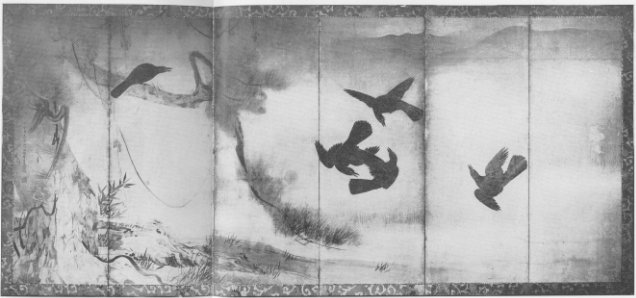 Plates 5A, 5B. "Crows and Herons." By Tohaku (1538-1610). Black monochrome, painted on a paper ground faintly decorated with gold. A pair of six-panelled screens, shown at the Special Loan Exhibition of Art Treasures from Japan, held at the Museum of Fine Arts in Boston, 1936. Owned by Baron Ino Dan, Tokyo.