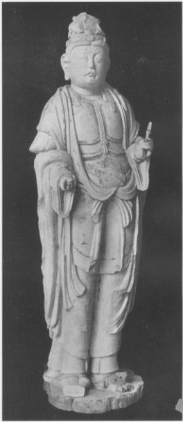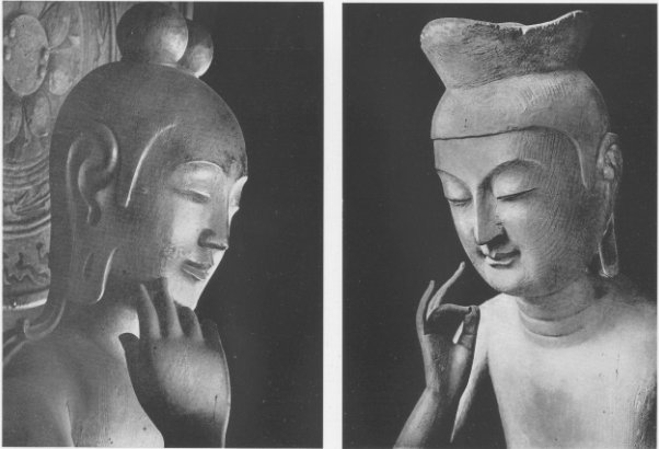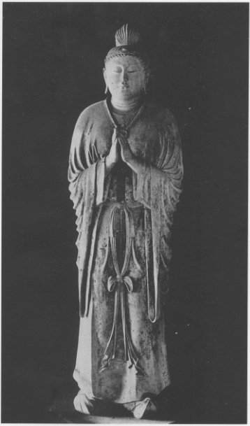 Somewhat similar examples may be found in sculpture. Visitors to the Imperial Household Museum at Nara may have noticed the clay figures of Bonten and Taishaku, which used to stand in the middle hall. A close observation of these will show that each has a wooden foundation, over which a thick coating of clay has been applied. Each of these images is represented as wearing a pair of decorated shoes shaped in clay, but a part of one of them is broken off, revealing the foot underneath carved in wood, each individual toe, and even the nail, being faithfully carved. (Plate 8) There are other examples: Kichijoten and Benzaiten, also in clay, installed in the Sangatsu-do of the Todaiji monastery, Nara, show evidence that the sleeves of the under-garment meets, one on top of the other, were first made before being covered with those of the outer robe.