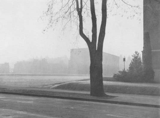 Plate 134. University of Oregon Campus in the mist on a frosty morning. The windowless Museum of Art in the distance. Eugene, Oregon.