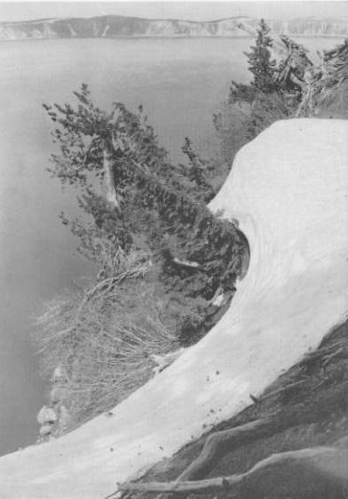 Plate 136. Remnant of Snow on the Bank of Crater Lake; suggesting a rhythmic flow with dead tree-trunks, gnarled roots, straggling shrubbery, and staggering broken trees. Oregon.