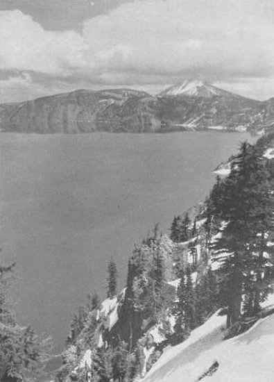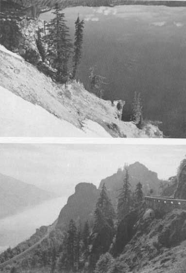 Some weather-worn trees clung to the jagged precipice with their gnarled roots swaying over the water. (Plate 136.) The colour of the water was fascinating as I looked down upon it from one of the hills towering up from the brink of the lake. A part of the lake reflected the surrounding cliffs and the clouds above as well, while the rest was a clear sheen, reflecting nothing but the brightness of the sky. When the sun was low and the trees on Wizard Island cast long shadows, the quiet was intense.
