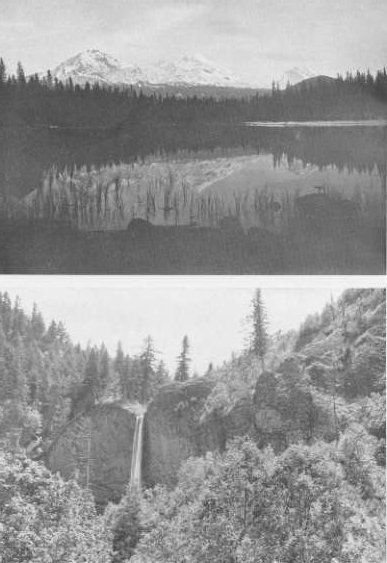 Plate 138. Upper: Three Sisters mirrored on a quiet lake in McKenzie Pass. Oregon. Lower: Latourelle Falls, Columbia River Highway. Oregon.