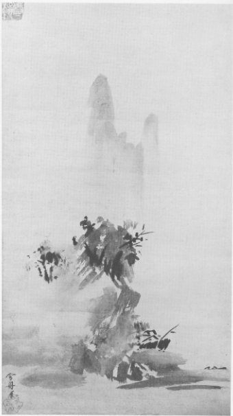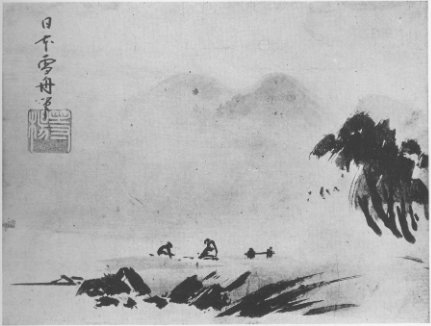 Shibumi is often felt in our black monochrome paintings, such as "A Landscape" in haboku style by Sesshu (Plate 11). With a few strokes of the brush - so few that you can almost count them - a landscape is depicted. At a glance it may be unintelligible, but as one observes it closely, there will slowly emerge out of chaos, as it were, a precipitous cliff jutting out into the water, with a grove of thriving trees growing on the top of the precipice. You may hear the sound of waves dashing against the rocks at the base of the precipice. On the other side of the cliff you may see some houses and fishing boats. A towering peak may be seen in the distance in the mist, with the suggestion of a vast expanse between the peak and the cliff. All these and still more images are suggested by very few strokes of the brush. The fresh verdure of the grove, the blue expanse of the sea, the vague distance of the mountain, and the fishermen's hamlet nestled on the sunny side of the cliff - all these in black monochrome lines and washes. The painting is simple, yet profound; it is saturated with shibumi.