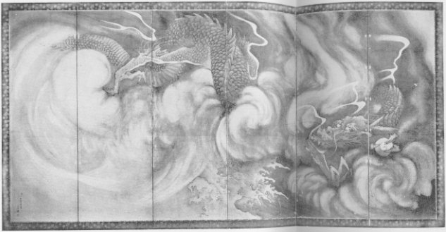 Plate 13. "Dragons and Clouds." Painted by Maruyama Okyo (1733-1795); in black on paper. A pair of six-panelled screens. Owned by Kanchi-in, Kyowo-Gokokuji, Kyoto.