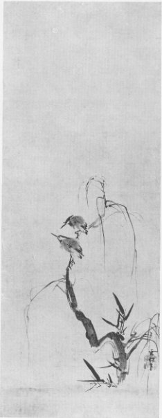 It is this spiritual rhythm, or rhythmic vitality, which has been the supreme aim of Eastern artists for many centuries past. The artists have gone one may say, a step farther than Daido in the story just cited in that they have taught us to seek the spiritual rhythm everywhere and in everything. The highest ideal of the painter in Japan, as was the case in China also, has been to represent everything he painted in its right relation to the Infinite. l am sure you can feel that spirit in the simple drawing, also in the present exhibition, by Sesson entitled "Herons on a Willow Tree." (Plate 14.) In it you can feel the immensity of the firmament and the relative position of the birds perched upon a swaying willow tree. Yes, that has always been the supreme aim of our painters. Whatever they painted, be it human figure, an insect, or a plant, they have tried, not only to depict the object itself, but to suggest or imply also its relative position in the scheme of the universe, revealing it, however trifling in form, as in right proportion to the Infinite. Not only in painting, but also in other forms of the art of Japan - such as sculpture, landscape gardening, tray-landscapes (bon-kei and bon-seki), designs on pottery or lacquerware, or even flower arrangement - this supreme aim manifests itself.