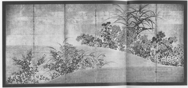 Permit me to call your attention to a pair of screens now being shown in the loan exhibition of Japanese art in this Museum. I refer to the pair entitled "Autumn Flowers" by Sosetsu, a seventeenth century painter. How I wish you could all have the chance to stand a while in front of those screens those of you who have not done so already - and allow yourselves to be impressed by the aristocratic dignity of Nature revealed in them! See how the hibiscus, tree-clover, chrysanthemums and other blooms mingle in her' monious profusion, and how the graceful pampas grass strikes the poetic note as it rises from the rhythmic flow of the clear, crisp and ethereal atmosphere of early autumn which emanates from them. Drink deep, if you will, the spiritual quality of the painting, and realize the poetic understanding of the life of plants and the spirit of Nature which the artist must have had in painting those pictures. (Plates 16A 16B.)