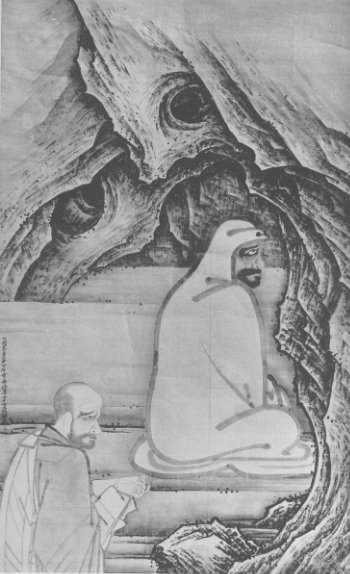 I think the high priest was right, and so in Zen one is expected to work out one's own salvation by meditation. It aims to transmit truth from one mind to another direct, without the medium of words. The meditation in Zen is by no means an easy task. Some may perhaps have seen the original or at least a reproduction of one of our great painter Sesshu's masterpieces representing Eka, a Chinese priest, with his amputated arm. (Plate 18.) For many years Dharma sat facing the stone wall in a cave in meditation, and his disciple Eka was not able to get his attention, until one day he cut off his arm, when for the first time Dharma turned toward him and said, "Ah, you are in earnest." In that way he was able to gain Dharma's confidence and get his great thoughts to transmit to his followers. This is, of course, an extreme case, but the tradition shows how serious one must be before one can attain enlightenment. (Plates 15, 17)