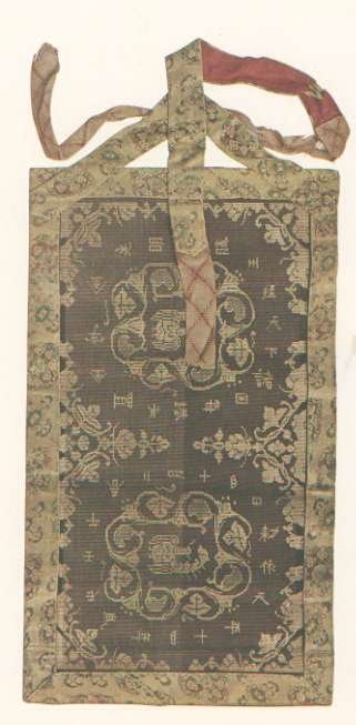 Plate 43. Cover for Saishowo-kyo Sutra. The woof is of fine split bamboo, which is not visible, as it is entirely covered with the warp of silk thread with which are woven floral designs and thirty-four ideographs, proclaiming, "In every pagoda in the various provinces throughout the realm, a copy of the Konkomyo Saishowo-kyo in gold letters is placed by the Imperial order issued on the 14th day, 2nd month, 14th year of Tempyo" (March 24, 742). Middle Section. Reproduced in colour.