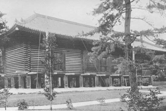 Plate 44. 44. The Shoso-in Building. Built of wood in 752. In three sections: North, Middle, alla South. Each section is provided with a door, but without steps leading up to it. The building has no windows, and the floor is about nine feet above ground.