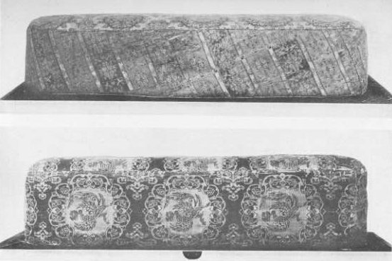 Plate 46. Upper: Arm-Rest, covered with striped brocade. The brocade is cut on the bias. North Section.
