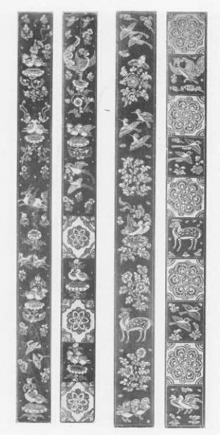 Plate 48. Ivory Footrules, carved in bachiru style. The ivory, finished in the desired form, was dyed or stained, then the design was carved on it, and later other colours were added to the unstained parts where the carving was deep. Obverse and reverse of two footrules. North Section.