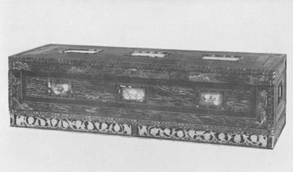 Plate 49. Box with Lid. Covered all over with jinko and shitan-wood, decorated with marquetry and drawings of waves and mountains. Decorated also with plaques with paintings of flowers and birds, animals and water, covered over with sheets of rock crystal. Middle Section.