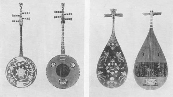 Right: Four-Stringed Biwa. Obverse and reverse. Of shitan-wood, inlaid with mother-of-pearl, amber and tortoise-shell. North Section.