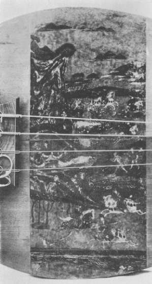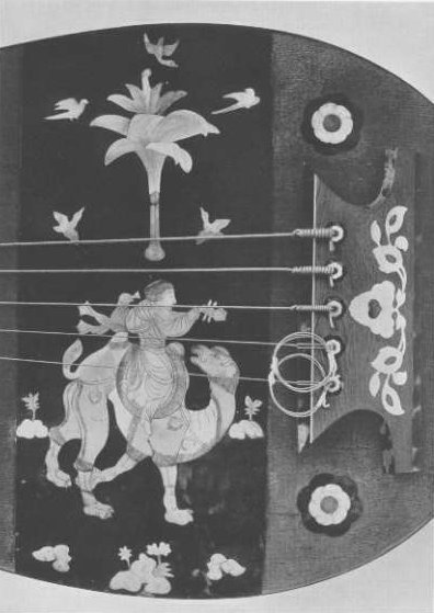 Plate 56. Lacquered Kin. Obverse and reverse. Of wood, lacquered and inlaid profusely with gold and silver in a style known as hyomon. For the translation of the inlaid inscription on the underside see pp. 120, 121. North Section.