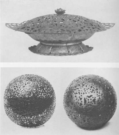 Right: Silver Incense Burner. Carved in open work, the design being floral scrolls containing a phoenix and a lion. Each contains a tray for burning incense supported on gimbals. North Section.