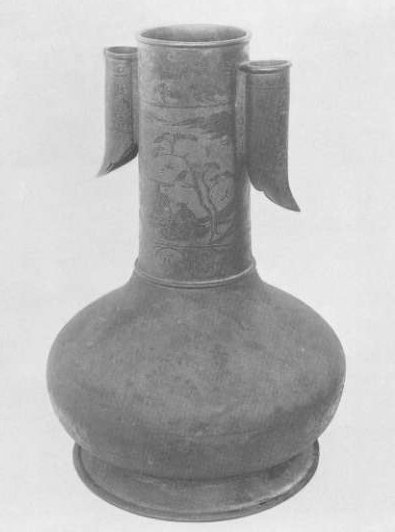 Plate 62. Toko, Gilt Copper Vase. Incised all over in designs of men and beasts, flowers and birds, mountains and clouds, etc. The vase was originally a ceremonial implement in ancient China, but it came to be used later for the game of throwing darts into it. Middle Section.
