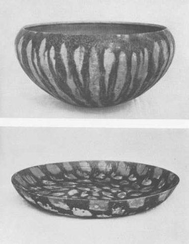 Plate 64. Upper: Pottery Bowl in the shape of an alms bowl; with bluish green streaks on white glaze. South Section. Lower: Large Pottery Plate, with splashes of green glaze on white. The provenance of these potteries is still in dispute. South Section.